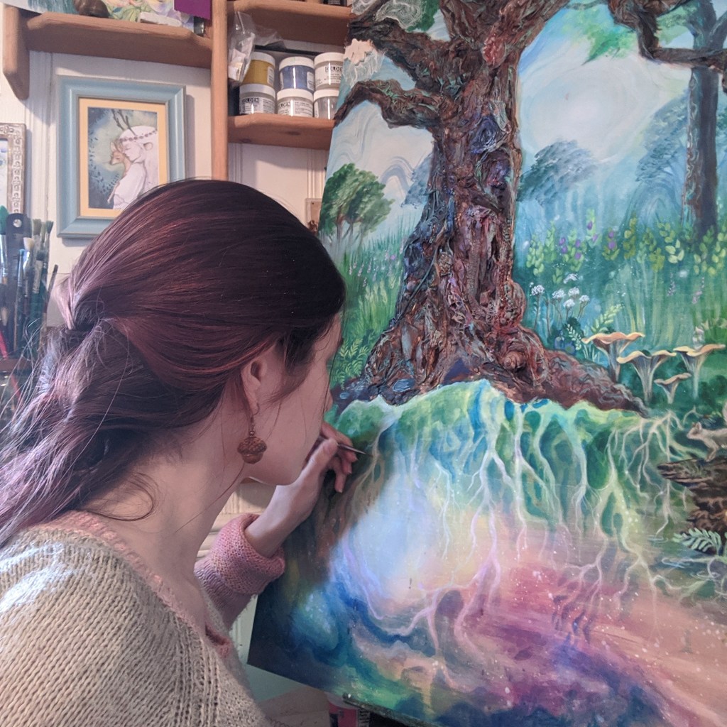 | Autumn Rozario Hall (she/her, ella/ellas) is a Latina painter, dreamer, mother, and sharer of stories. She lives and works in Des Moines, Iowa. She is a recipient of two Community Art Grants from the Iowa Natural Heritage Foundation and is working within the rewilding movement, blending art with environmental outreach in the form of gallery shows, native plant workshops, and writing. Through her work she seeks to share a sense of wonder and create art that inspires and uplifts. Her acrylic and mixed media paintings explore story and human connectivity to nature. |