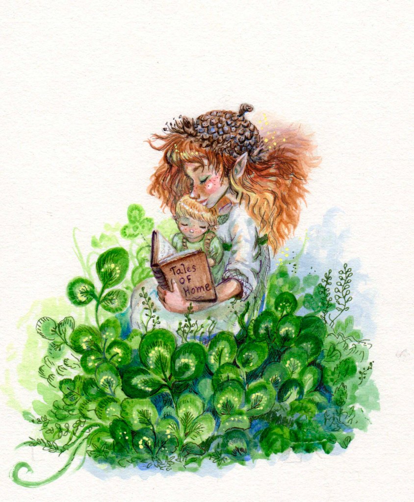 | Materials: acrylic on paper. Watery washes of acrylic paint were layered on coldpress watercolor paper to create luminous color. The painting is a reflection on the joy of stories shared and finding moments of wonder in the ordinary. |