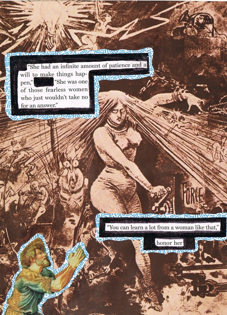 | “Honor Her” is a mixed media collage, hand-pieced and glued onto a sheet of 5×7 cardstock. What appeals to me about this kind of work is that it is made from common materials, easily found and sourced. It’s compiled of images from old textbooks and the inside of security envelopes. The text is from a magazine article that has been redacted, leaving only the intended message, and combined with the image of a fearsome woman, the piece as a whole speaks to the power that women hold. Such power should be honored. |