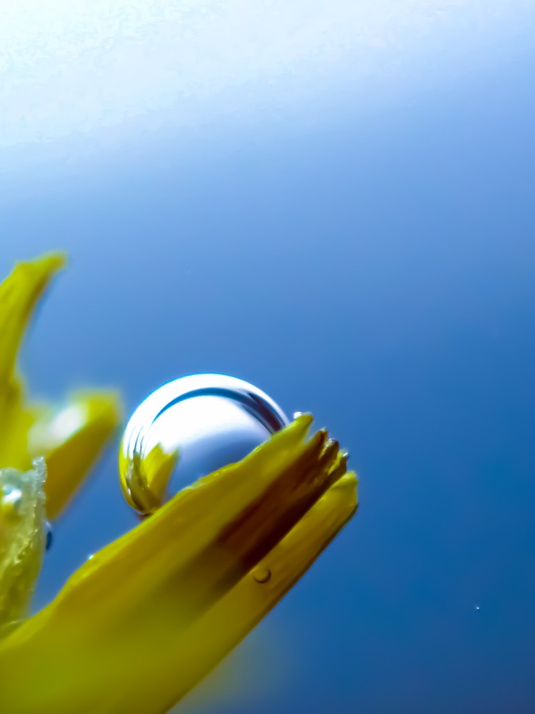 | “Hope Bubble” is an underwater macro photo of the tip of a yellow dandelion. Upon first view, it may appear that the sphere on the petal is a water droplet – but it’s just the opposite: it’s an air bubble in the water. Light, air, and water come together to make a photo that is, I hope, pleasingly ethereal and otherworldly. I don’t want the viewer to realize the piece was taken in a sink in my powder room, but instead, the viewer might imagine it’s a dance of light, air, and water. Those three elements, vital for life, unite us all. |