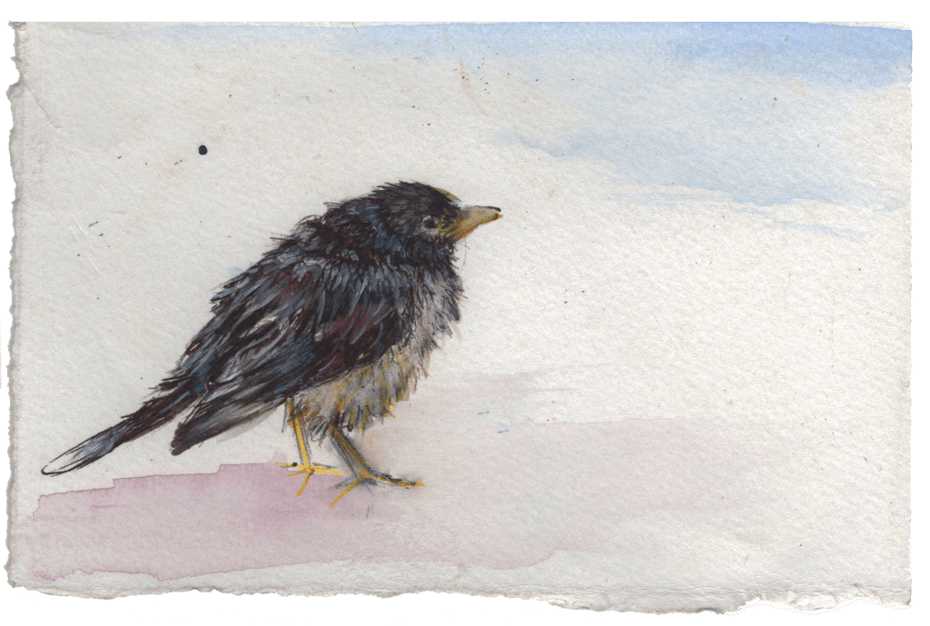 | Materials used: Watercolor and ink, using recycled cold press paper Sturnus Vulgaris The European Starling’s adaptability has allowed it to establish itself across diverse habitats worldwide, from coastal wetlands to alpine forests, often aided by human interventions, such as its 1890 introduction to New York’s Central Park. Despite its success, intensive agriculture has caused population declines of over 50%, leading to red-listing in some regions. This highlights the delicate balance between human actions and the need for coexistence with the natural world to preserve such resilient species. |