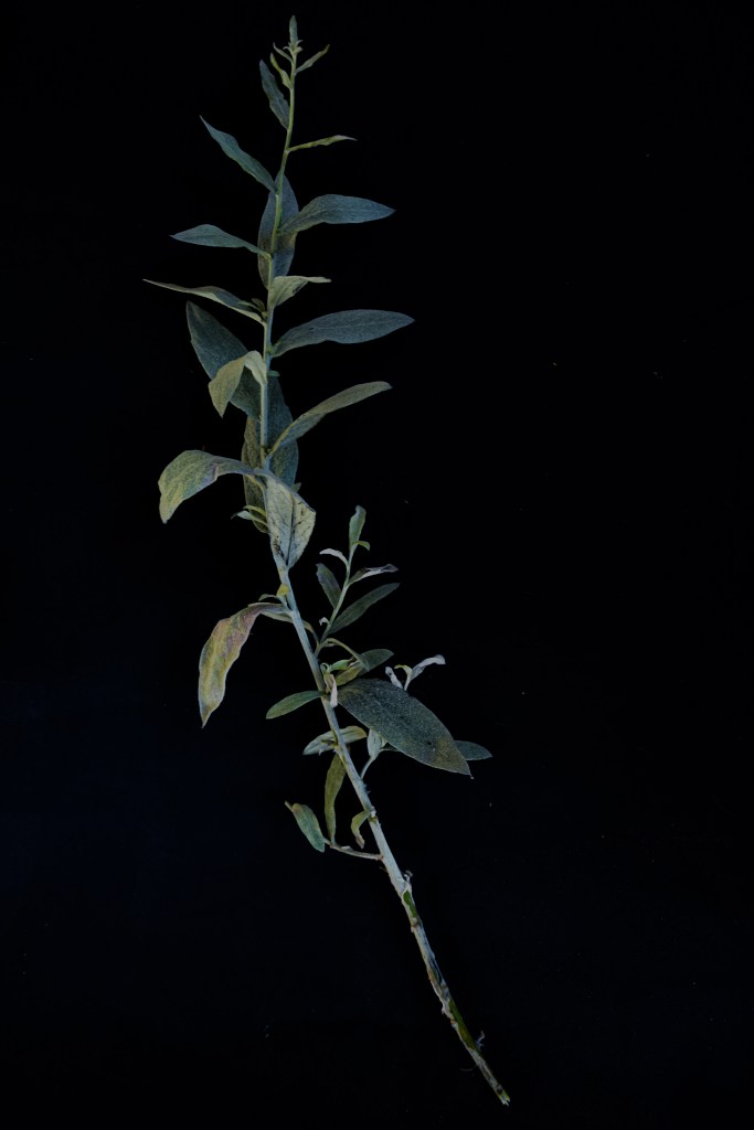 | This work was created using a live plant picked from a neighbor’s yard. Placed on a black background, this plant was picked before the first snow of the year and was made to document the growth of the plant before it died. These plants (Salix candida) are resilient, blooming in late winter. This piece is a metaphor for coming upon hard times and then representing the season’s regrowth after a long and cold winter. |