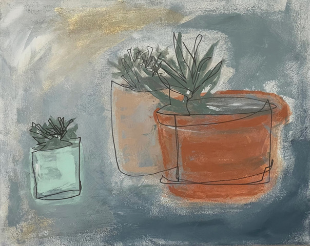 | Mandee Nicole works with continuous line contour drawings in her paintings to show the interconnection between everything in nature, bridge separation and belonging, and reflect on of our connection to our inner and outer landscapes and our inner and outer nature in order to rediscover our true inner nature and develop reciprocal appreciation for our planet. In this particular piece, plants and sunshine, we witness the connection between plants being nourished by the subtle and optimistic golden shimmer of sunshine through a cloudy sky. |