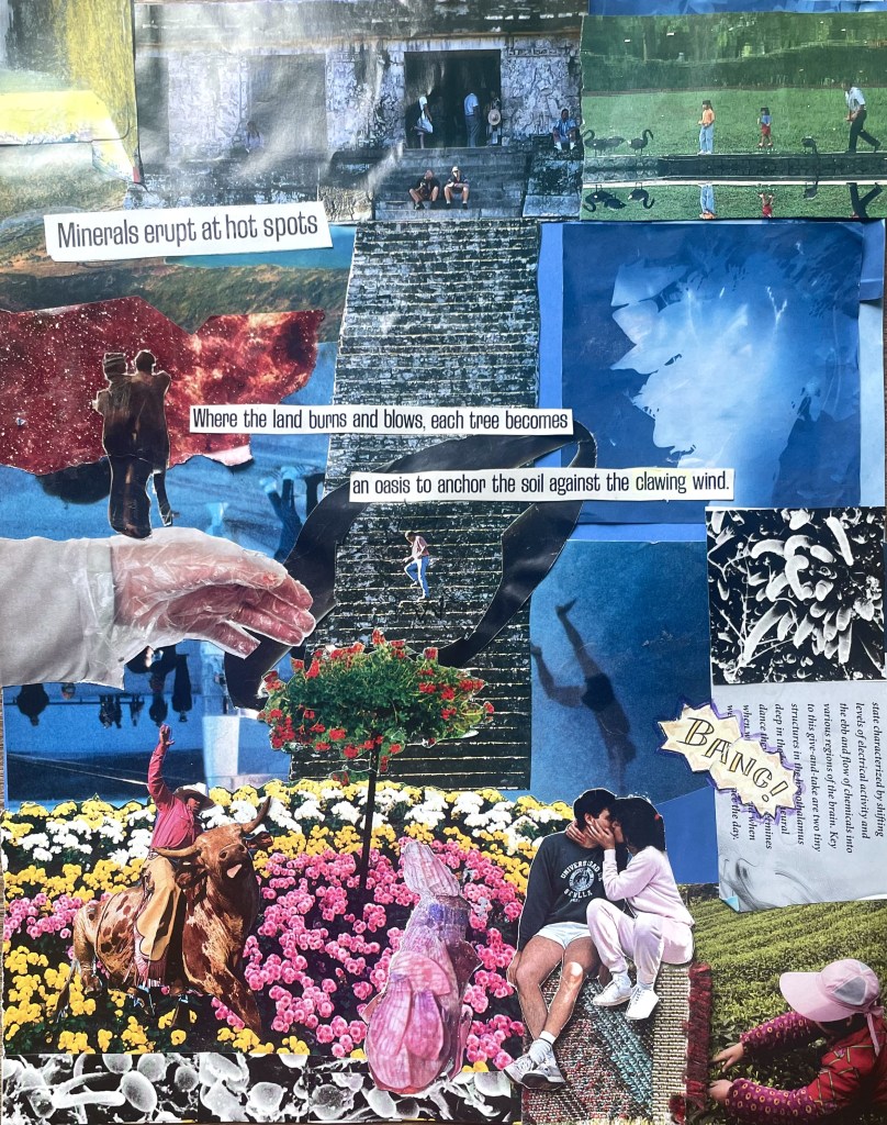 | –Materials used: Scissors, glue, markers, vintage magazines, found objects (homemade cyanotype, torn rug) –Specific methods used: Layering large blocks of paper, figures, words and found objects –Meaning behind the work: My therapist asked me to make a self portrait, and this is the result. It’s about feeling lost, then found, and lost, and found, on and on. –Other info: I loved playing with color, contrast, and fun, blocky shapes in this piece. I also wanted to anchor this collage — although abstract — in my own reality, so I included a cyanotype I made in my friend’s front yard and a torn piece from a rug I found in my garage. At the time of making this piece I felt like I was at a mental rock bottom; in the process of creating it I realized, hey, at least it’s only up from here. |