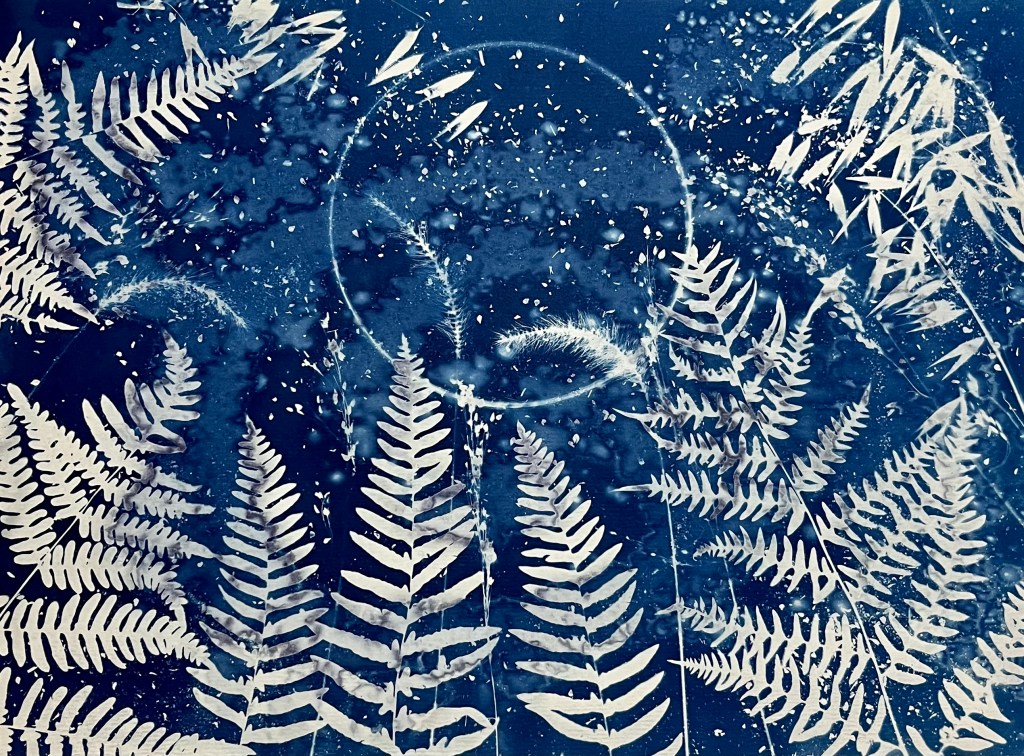 | “Sleepwalking” is a Cyanotype crafted with botanicals grown from the artist’s garden and foraged from walks in the woods. The Cyanotype process is a historical, alternative photographic blueprint process that uses ultraviolet light-sensitive iron salts, and produces a negative of an object or image through contact-printing, using sunlight as the source of exposure, and developing the image in water. This elemental process deeply resonates with the artist, who blends their water sign personality with a passion for horticulture, and finds therapeutic influence in growing botanicals and tending to their garden every season. The artist uses their garden as a source for botanicals to reimagine into art, and prints their artwork in the garden in sunlight. |