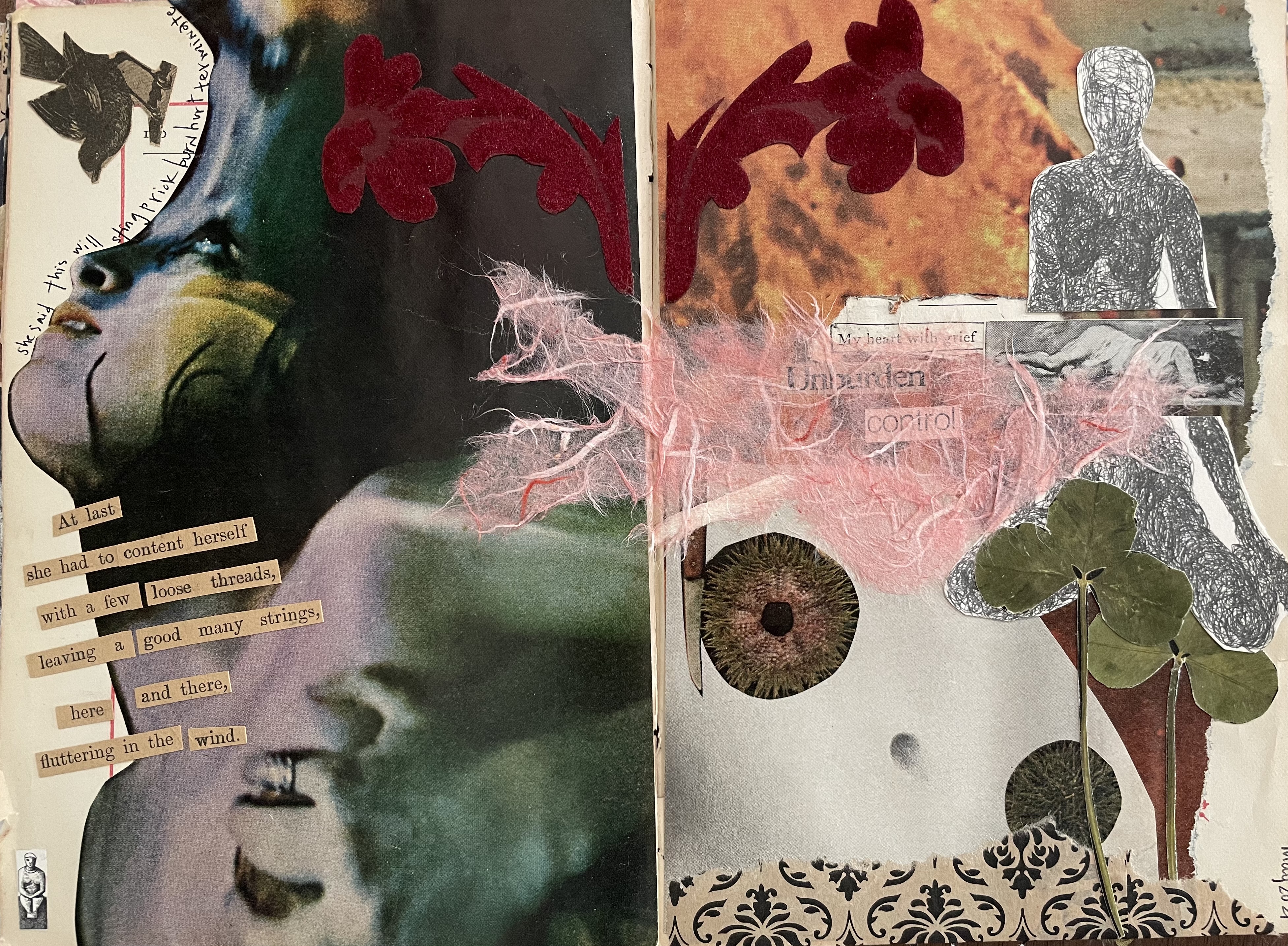 | Collage is a place where I process grief, explore paradox, and work to alchemize the scraps of life into something meaningful. All of my collages were born and live inside an old book of poetry I found on a used bookstore shelf years ago. The book itself has become an ever-evolving collection of art. The Seed is composed of mixed papers, photographs, and drawings. This piece emerged from the pain of experiencing an ectopic pregnancy. It is my hope that those who have experienced loss in any form may find some solace in my work. |